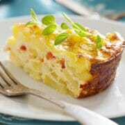 Upprepa detta till dess att potatisen tagit slut. Strö över osten och ställ mitt i ugnen och baka till dess att osten fått fin färg. Det brukar ta ca 15 minuter.
