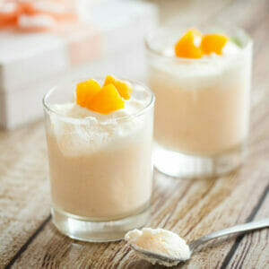 Låt persikorna rinna av. Spara fruktspadet i burken så att du får 2 dl vätska. Räcker inte spadet så tillsätt med vatten till 2 dl. Häll spadet i en kastrull och lös upp gelatinet. Sätt på medelvärme och tillsätt äggulorna under omrörning. Låt koka upp och ta av värmen. Rör i citronsaft, vanilj och en nypa salt. Låt svalna.