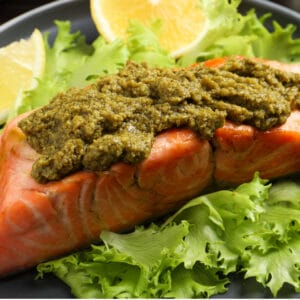 Värm ugnen till 175 grader. Lägg laxfiléerna på bakpapper på en plåt. Pensla generöst med olivolja på filéerna. Salta och peppra. Bred ut peston över laxen. Stoppa plåten i ugnen och låt den baka ca 25 minuter. Laxen ska vara lite rosa när den är klar. Servera med grön sallad och citronskivor.