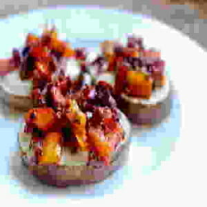 Ta potatisen ut ugnen och låt den ligga kvar på plåten. Lägg försiktigt på oströra på alla potatisskivorna. Toppa med röran på paprika och chorizo. Servera direkt.