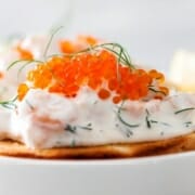 Placera räkröran i ett vackert torn på toasten och dekorera med en sked rom och en dillkvist.