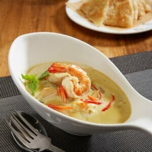Vänd försiktigt ner räkorna. Servera med en citronklyfta och en kvist persilja och med en bit smörstekt bröd på sidan.