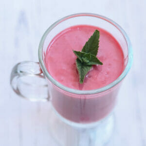 Ta bort stam och rot från rödbetorna och skala dem. Skär i bitar och kör tillsammans med citronjuicen i en matberedare till en slät mousse.