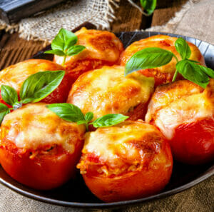 Fyll rotfruktsröran i de tomma tomaterna . Toppa med riven Västerbottensost. Baka i ugnen i ca 20 minuter. Servera med färsk basilika.