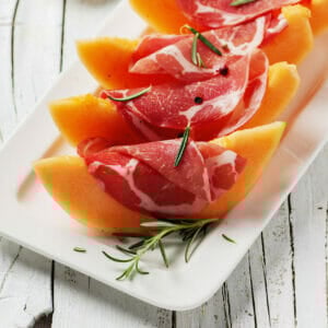 Dela melonen i halvor och gröp ut kärnorna. Kasta bort dem. Skopa upp kulor av melonköttet med en glassked eller en vass rundad sked. Du kan skära kuber också om du tycker att kulorna blir jobbiga. Skär skinkskivorna i vardera tre strimlor på längden.