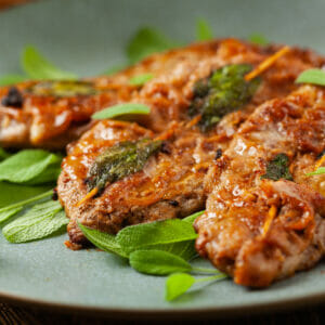 Flytta kycklingen till ett ugnsfast fat. Montera en skiva skinka över varje kycklingbröst och rikligt med salvia på toppen. Stoppa kycklingen i ugnen och baka till dess att skinkan mjuknat. Toppa med mer färsk salvia.