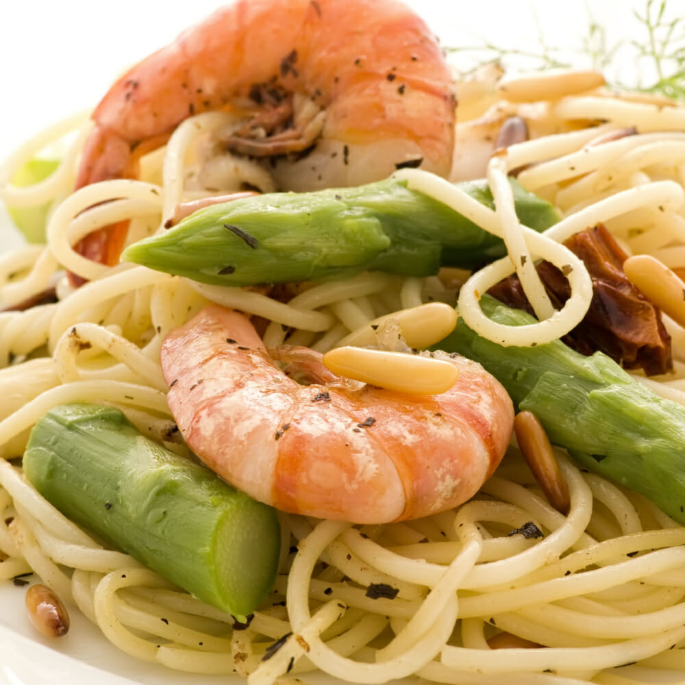Hetta upp såsen i en kastrull. När spagettin är klar häller du bort vattnet och låter spagettin ånga torr. Blanda den varma såsen med pastan och vänd så att det blir ordentligt blandat. Vänd ner räkorna i pastan och placera sist sparrisbitarna i spagettin. Servera direkt.