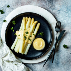 12 vita sparris (Tänk på att sparris måste ätas färsk och att tjockare sparris är bättre än tunnare oavsett om det är grön eller vit sparris. Efter fyra dagar försvinner mycket av smaken och konsistensen blir träig.)