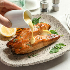 Hetta upp olja och smör i en stekpanna och stek fyra minuter per sida. Vänd försiktigt så att laxen håller ihop. Ta laxen ur stekpannan och gör inte pannan ren. Håll laxbitarna varma.