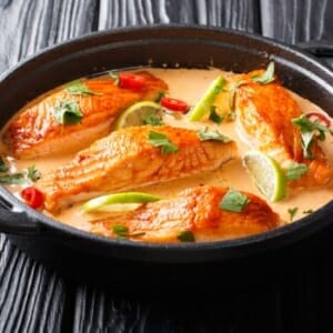 Riv skalet av två av limefrukterna och tillsätt till såsen. Pressa saften ur de två frukterna i såsen. Tillsätt kokosmjölken och koka upp. Koka starkt så att det reducerar med ca 1/3. Lägg tillbaka laxen i såsen och låt det sjuda på spisen under lock ytterligare 10 minuter. Lägg skivad lime i såsen och strö över koriandern.