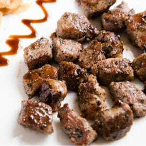 Hetta upp en stekpanna. Lägg i oljan och så snart den blivit het lägger du i köttet. Spara eventuell marinad som är över till senare. Vänd runt köttet.