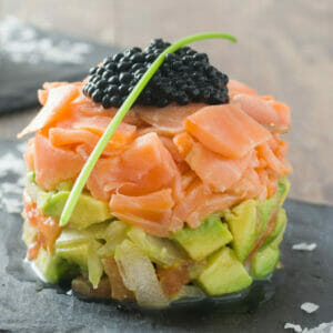 Fyll kaffekopparna till hälften med laxbitar och tryck till lite. Toppa sedan med avokadoblandningen och pressa samman ordentligt så att all luft försvinner.