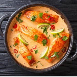 Klicka ner all currypasta i den kokande kokosmjölken och vispa till dess att den löst sig. Lägg i laxbitarna och låt koka i 4 minuter. Lägg i mangobitarna, limeskivorna och chilin. Koka i ytterligare 4 minuter.