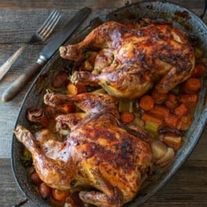 Dela kycklingen i portionsbitar. Servera med grönsakerna och lite sås