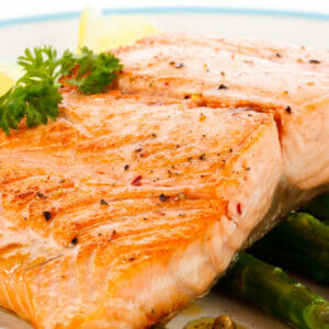 Servera laxen med några sparrisar och placera en eller ett par skivor stekt citron ovanpå laxen. Finns det kryddsmör, flytande i formen så öser du det över laxen.