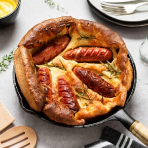 En riktig klassiker. Vi har ändrat lite och i stället för bacon eller fläsk har vi hela korvar, som gör det till en lite annorlunda rätt. Nästan som en english breakfast och en utmärkt brunch-rätt. Och naturligtvis lättlagad.