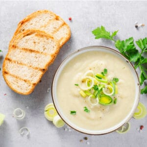 Servera soppan het med lite skivad purjolök och bröd vid sidan eller som krutonger i soppan.